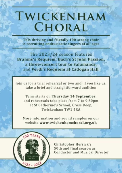 Come and try Twickenham Choral for a rehearsal or two and, if you like what you hear, join up for the rest of this season. Rehearsals for the summer term start on Thursday 11th April at St. Catherine’s School, Twickenham.